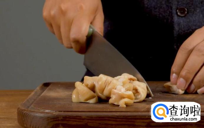 这个菜最麻烦的是在肥肠的清洗上, 在清洗肥肠的时候,可以是由外向内,慢慢推着把肥肠翻过来,然后再用面粉和白醋去搓,尽可能把肥肠内壁上面的油脂去掉。这样对于祛除它的异味,效果也会很显著。