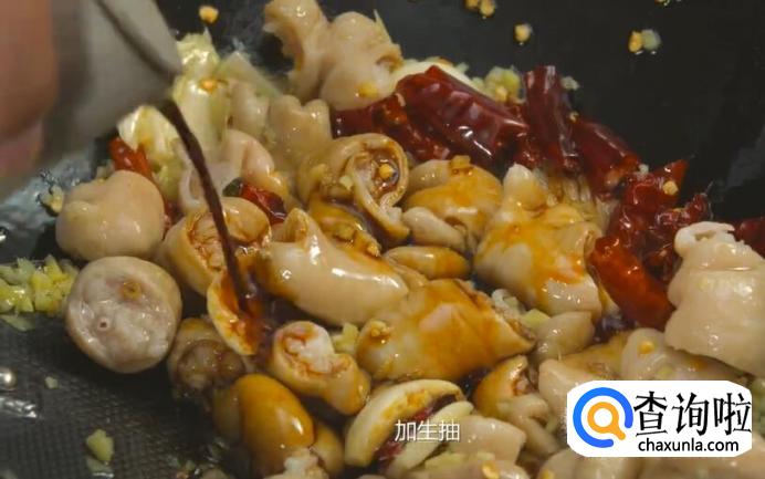 放入肥肠翻炒。加生抽、糖、盐调味,直至肥肠炒熟。