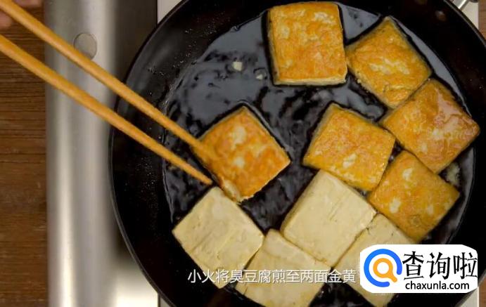 起锅,加入油,小火将臭豆腐煎至两面金黄。