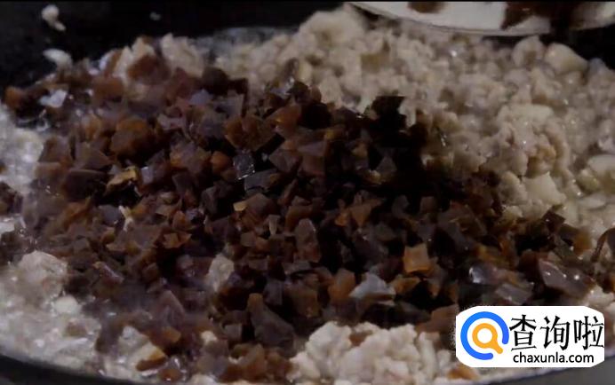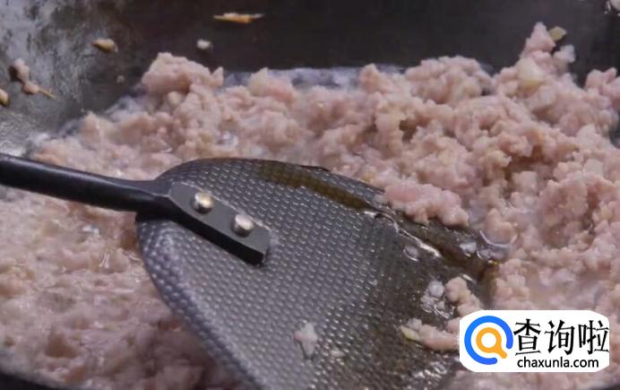 加肉末煸炒到微微焦香,再放入香菇丁、大头菜炒匀。