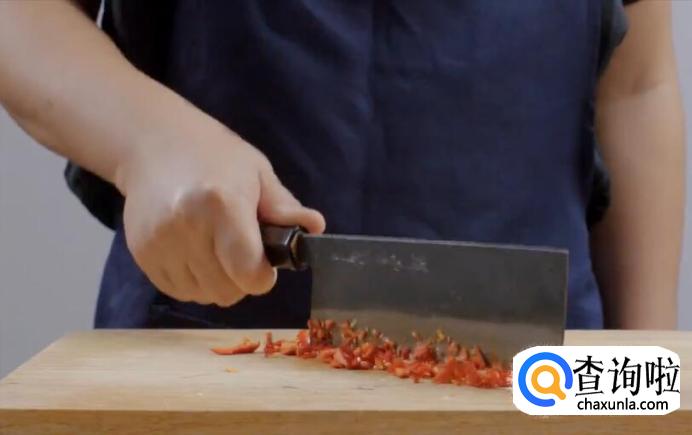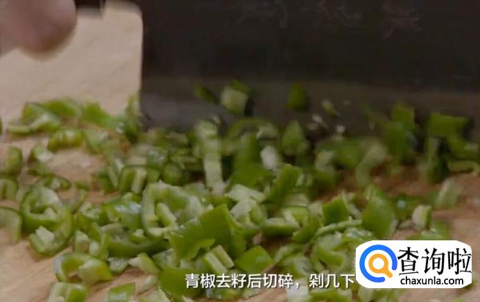 青椒去籽后切碎,剁几下。