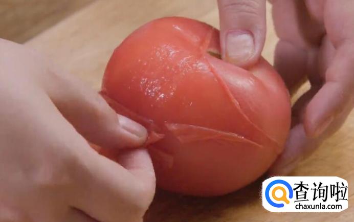 西红柿放入开水中烫一下,然后去皮。