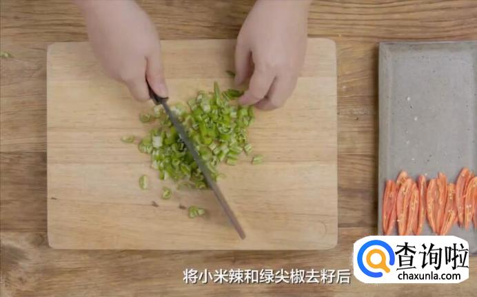 将小米椒和绿尖椒去籽后,切丁剁碎。
