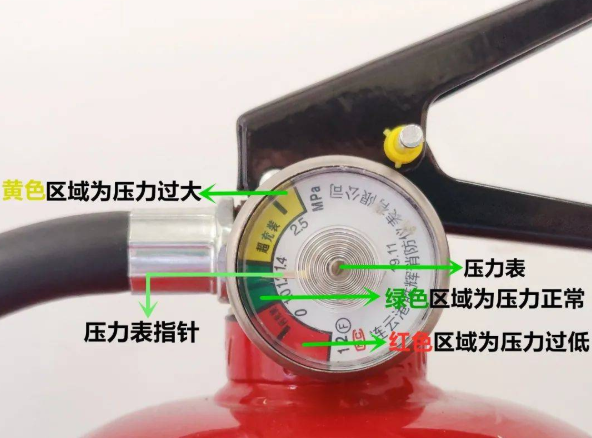 灭火器的压力表指针指在“绿色区域”时表示压力正常。而当针处于红色或黄色位置时,需要及时维修,以免带来不必要的麻烦。
