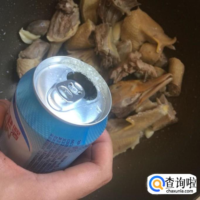 往锅中倒入一瓶啤酒,如下图所示。