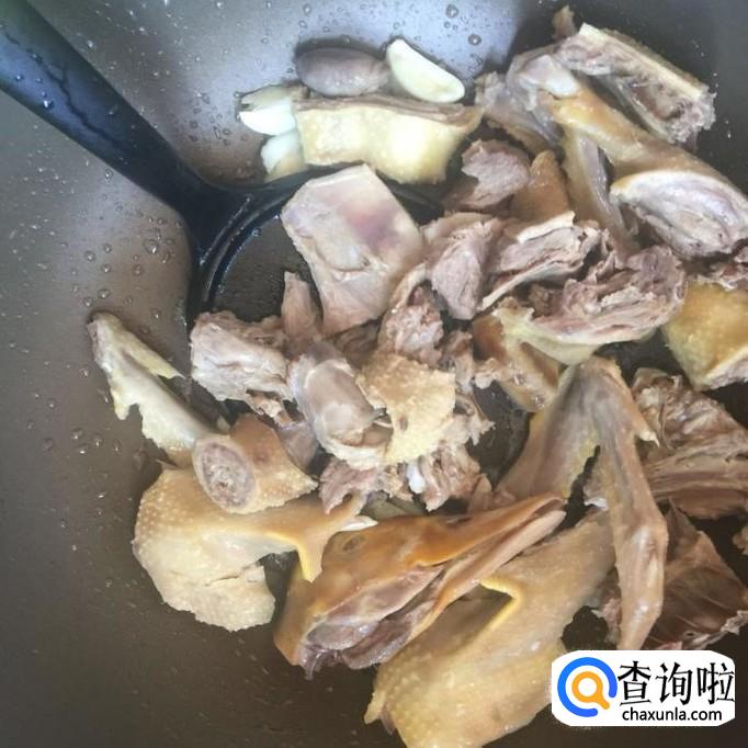 接着过中饭入适量的食用油,待油冒烟倒入蒜头爆香。然后倒入鸭肉翻炒五分钟。