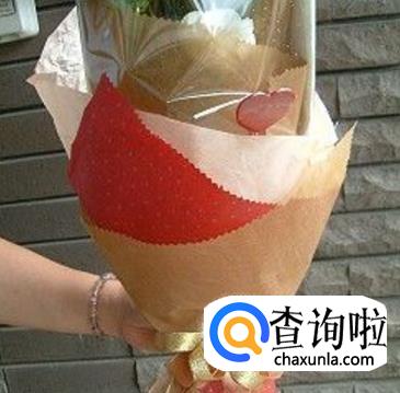 花束在包装纸层层包装下,再加上一颗小红心和系上蝴蝶结。