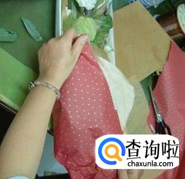 再将花摆放成有高低有致协调感,束起来,尾端先用纸稍微包一下。