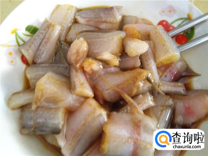 切好的水鳝再切成3公分小段,加入酱油、黄酒搅拌一下,腌十分钟。