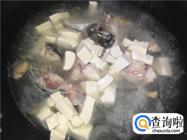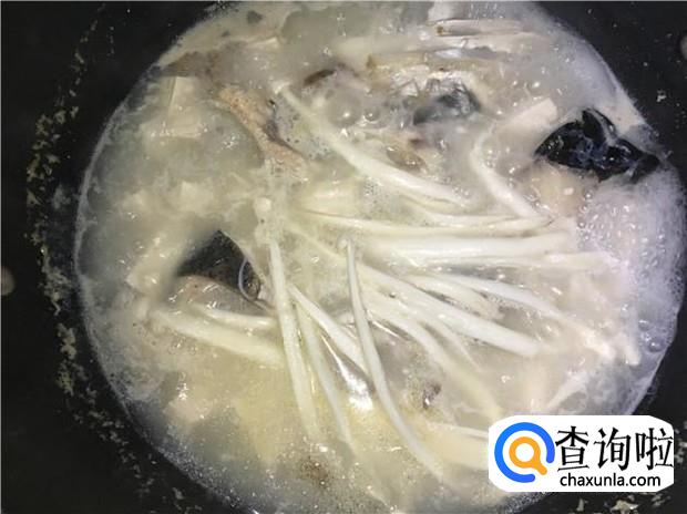 把鱼头豆腐汤煮开后,再把海鲜菇放入锅中,再次把鱼头汤给煮开。最后,洒入少许盐,即可出锅了,美味的豆腐海鲜菇鱼头汤就做好了。