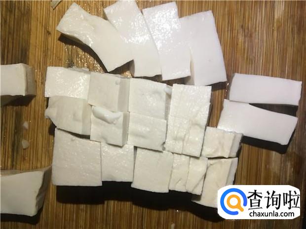 嫩豆腐用盐水泡5分钟,去除豆腥味,再切成丁状。