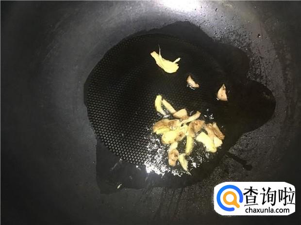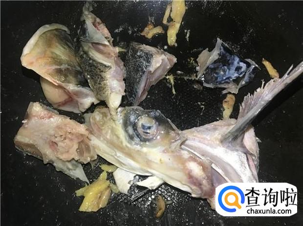 热锅下油,放入老姜炒香,然后倒入鱼头,小火把鱼头两面都煎一下。