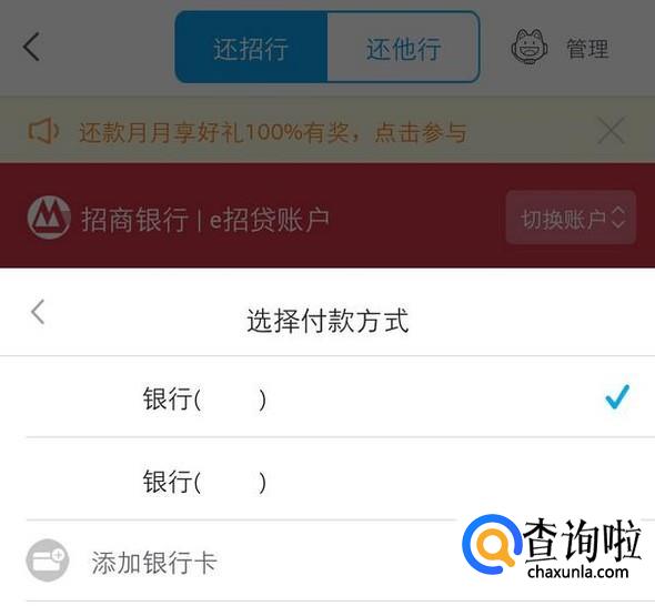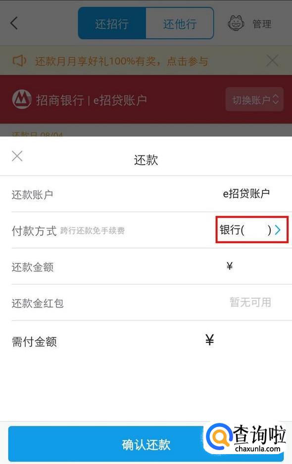 点击付款方式,弹出银行卡列表,选择用于还款的卡,自动返回,确认还款即可;