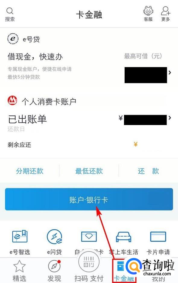 打开掌上生活APP,点到“卡金融”页面,点击“账户·银行卡”;