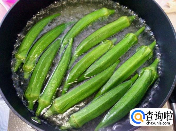 接下来我们需要把清洗干净的秋葵放入冷水锅里面煮熟,煮熟后捞出备用。
