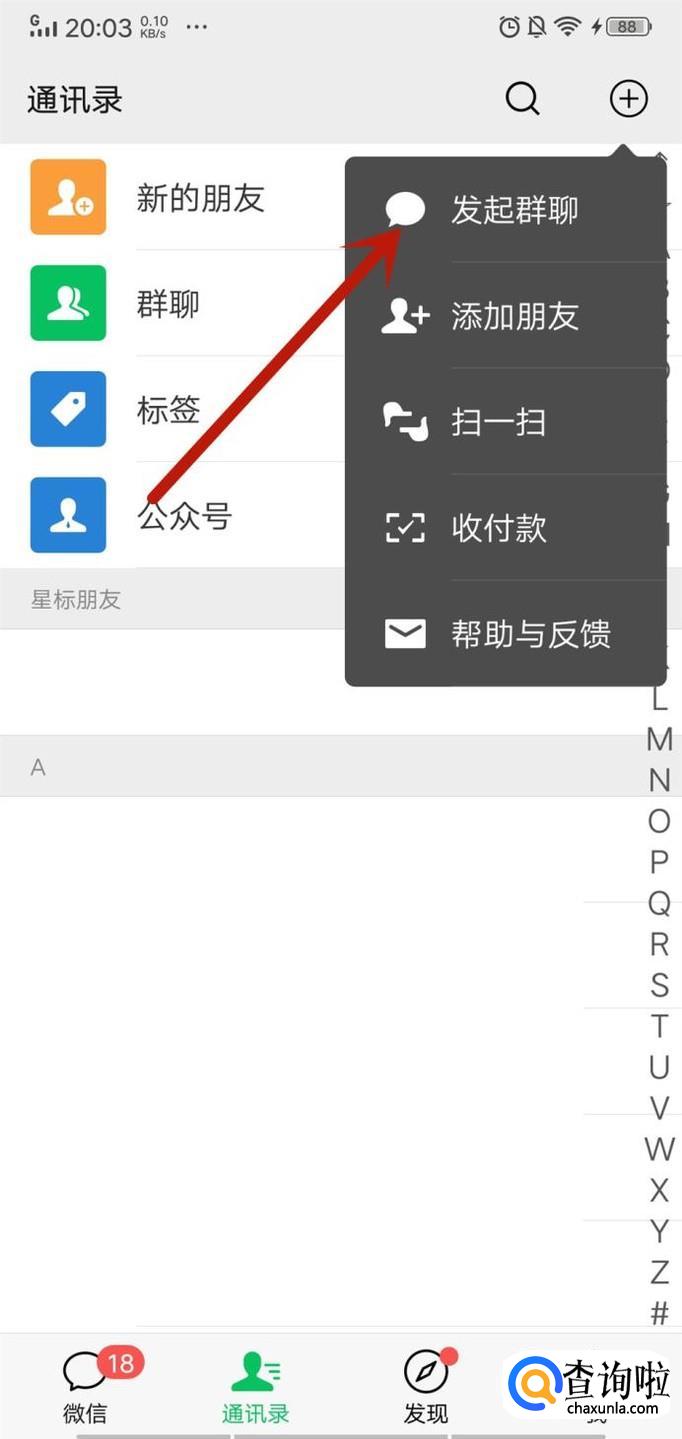 然后在弹出来的选项中,点击第一个“发起群聊”选项,如图所示。