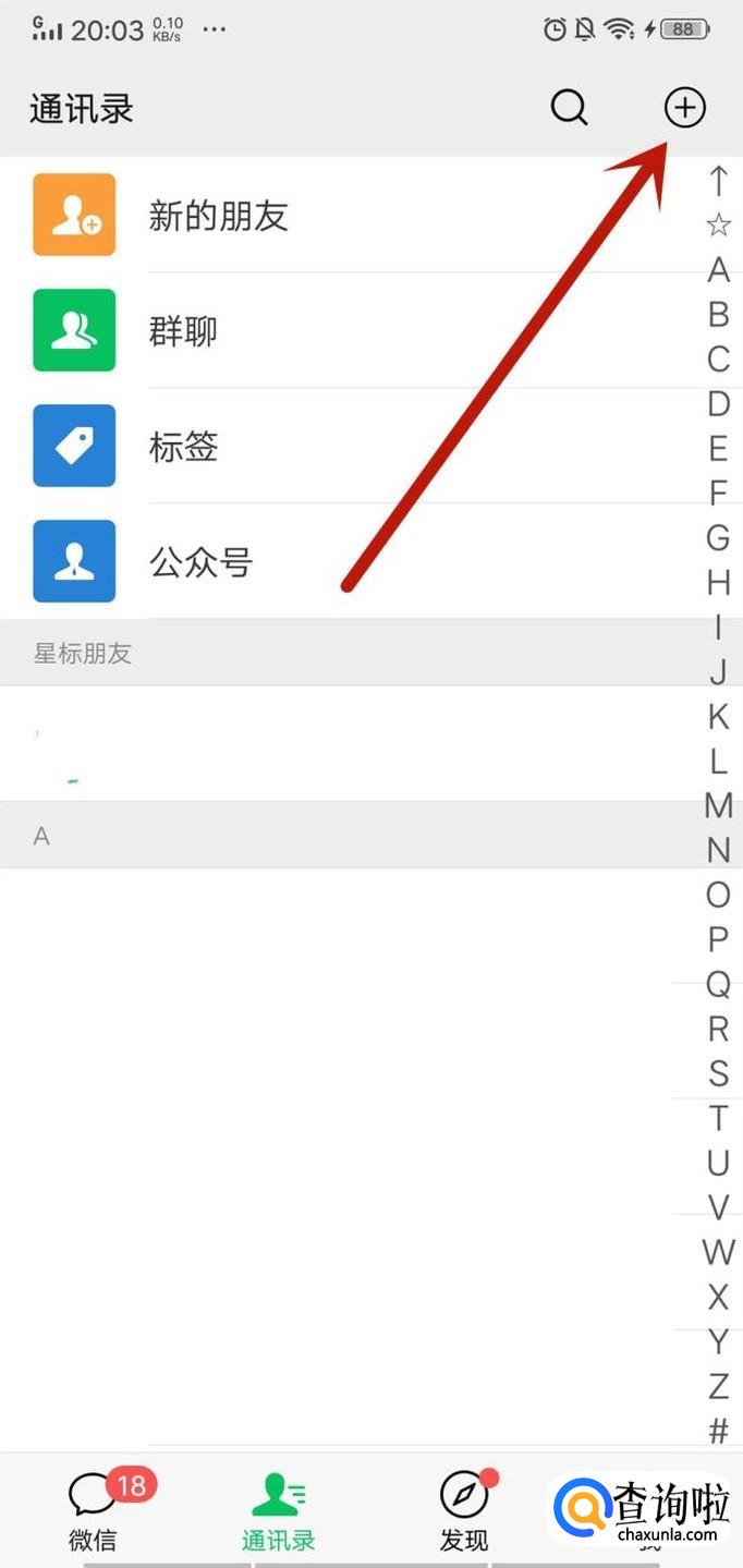 首先需要在微信的通讯录页面,点击右上角的“+”按钮,如图所示。