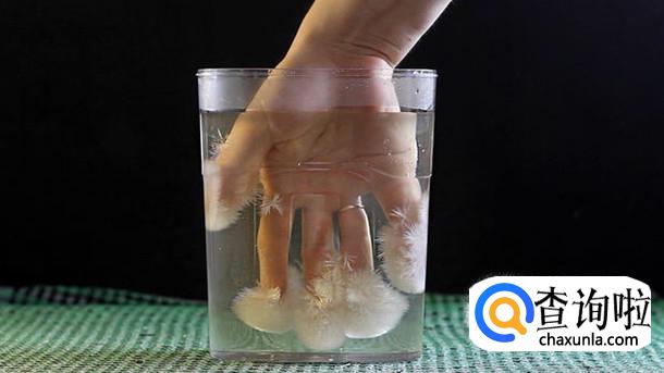 另一种玩法是在每根手指上粘一点醋酸钠晶体,然后直接伸入杯中,冰就会从每根手指处“生根”。