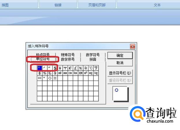 在“插入特殊符号”选项框中,点击“单位符号”标签,就可以看到“度、分、秒”的符号了,我们用此方法分别插入即可。