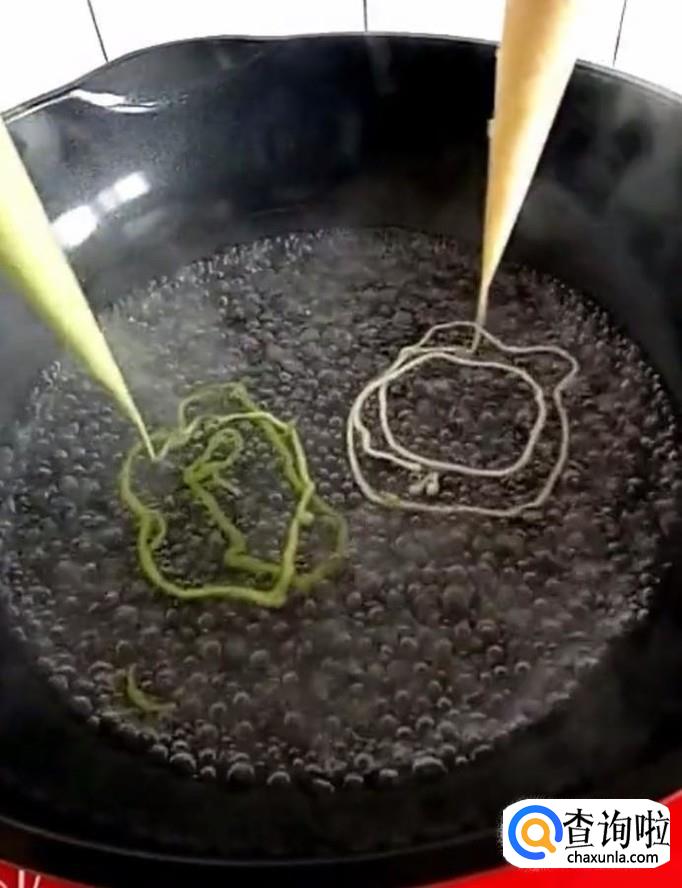 接着我们将两种面糊分别装入裱花袋中,挤入开水锅中煮熟