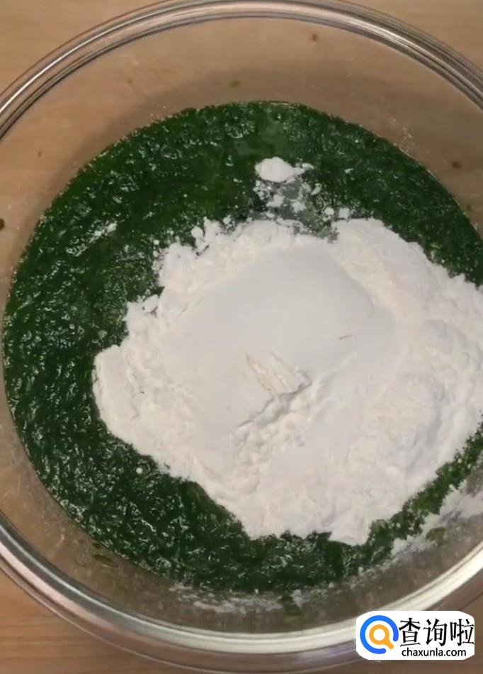 然后我们在菠菜汁中打入一个鸡蛋,加入适量的面粉,搅拌成面糊备用,牛奶加入适量的面粉,打入一个鸡蛋,搅拌成面糊备用