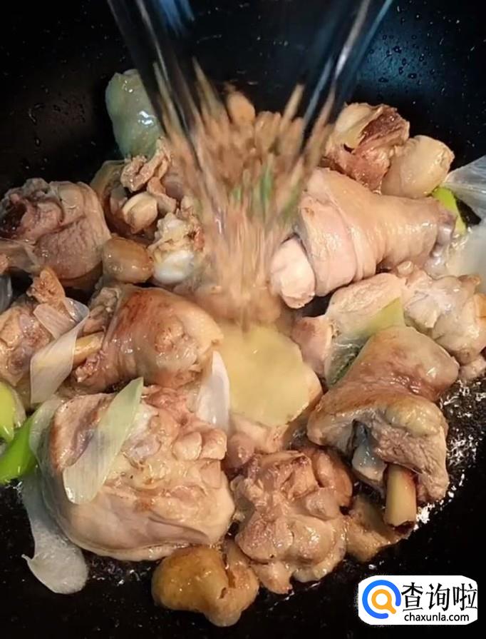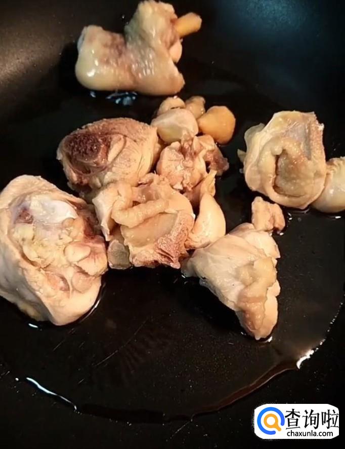 然后我们在锅中放入少许油,放入鸡腿块,再放入适量的葱姜,炒出香味