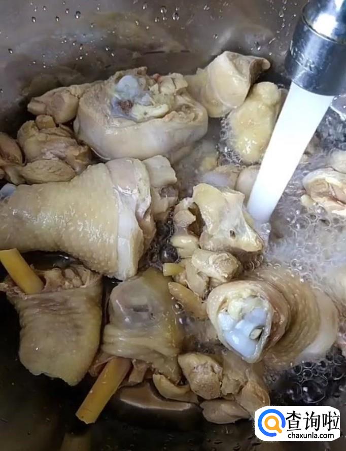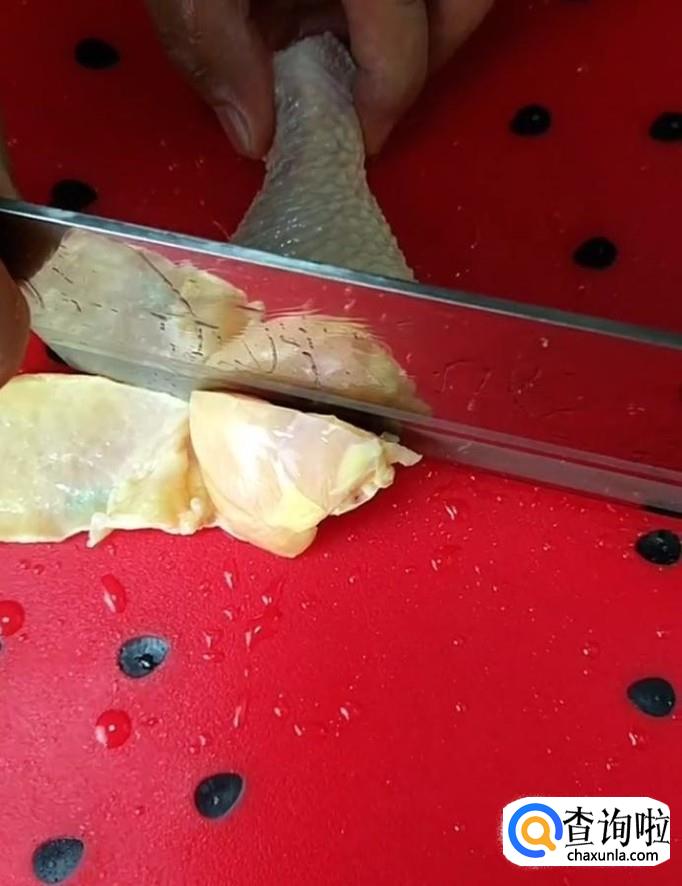 首先我们将鸡腿用刀剁成小块,放入凉水锅中,煮出血沫,捞出来,放入凉水中冲洗干净,控水备用