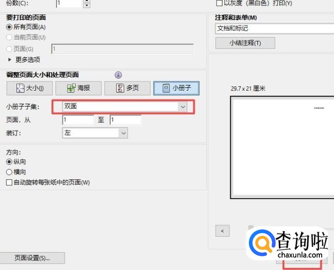 弹出的界面,我们将小册子子集设置成双面,然后我们点击打印就可以了。这样就是双面打印了。