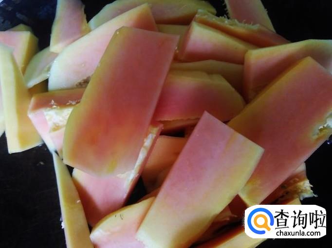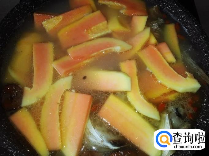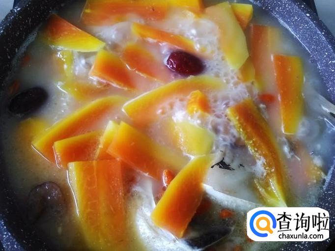 煲到汤水变成奶白色大概10分钟左右,打开盖子放木瓜进去。