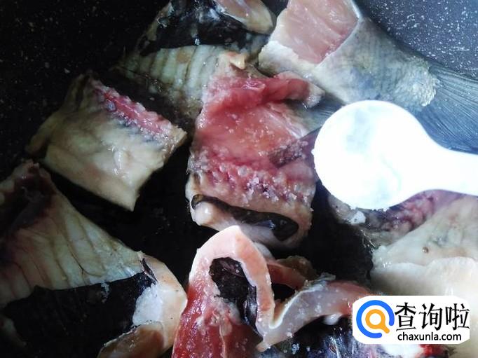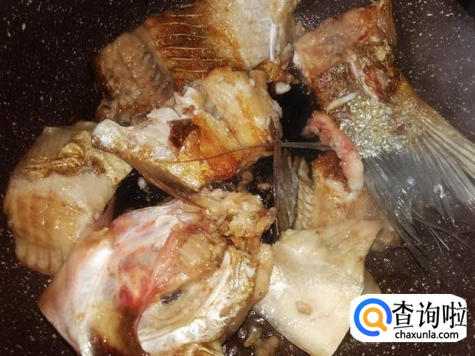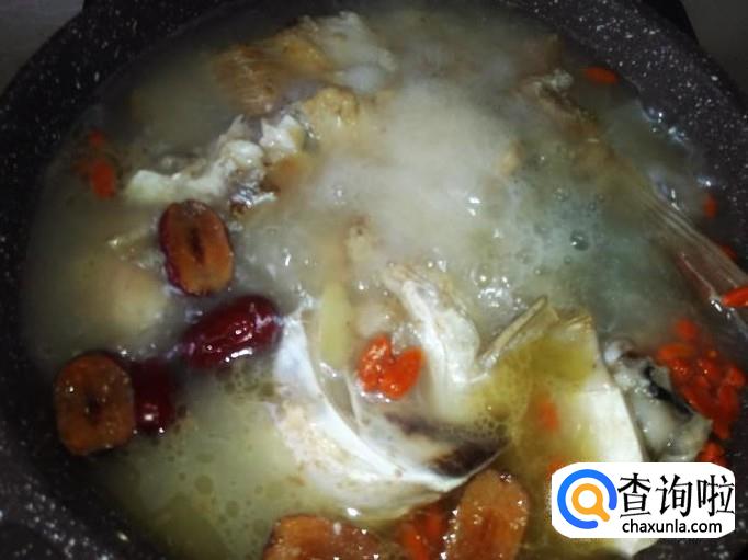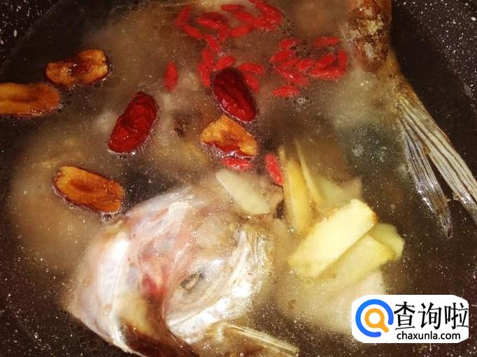 把鱼骨煎至两面焦黄色,然后加水,水量要没过食材,再加适量的料酒、枸杞、红枣、姜丝放进去。