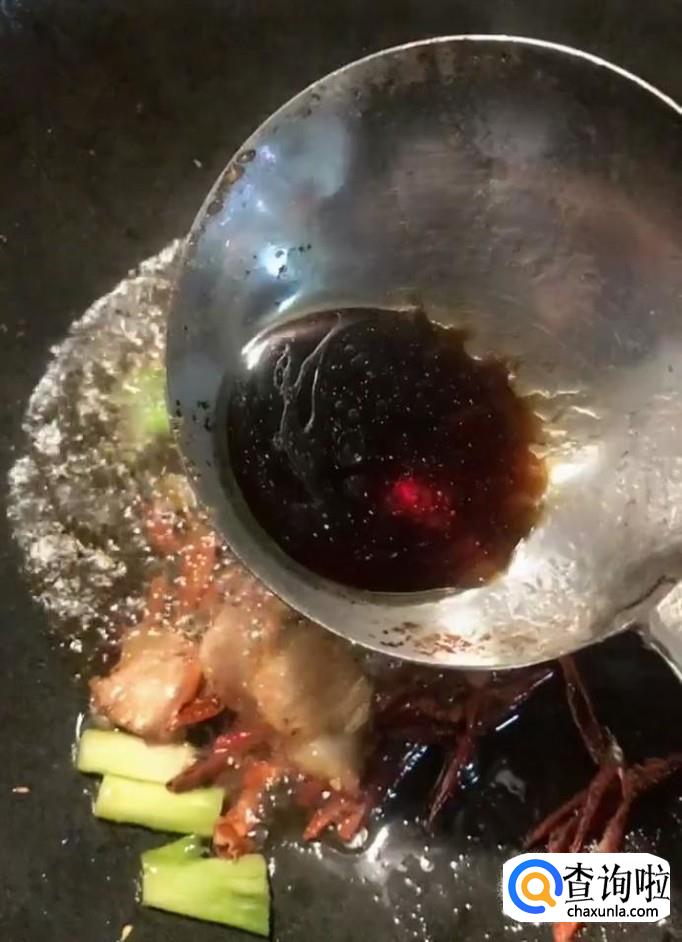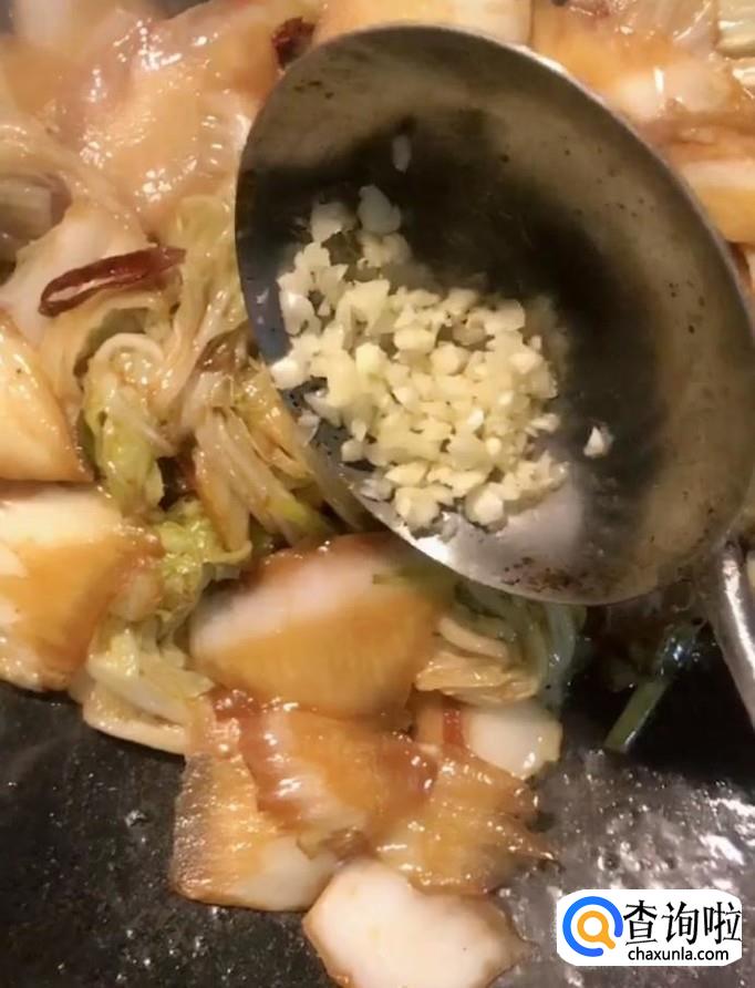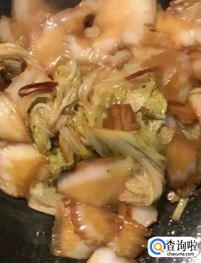 接着我们倒入适量的生抽,老抽,再放入白菜帮,炒一分钟