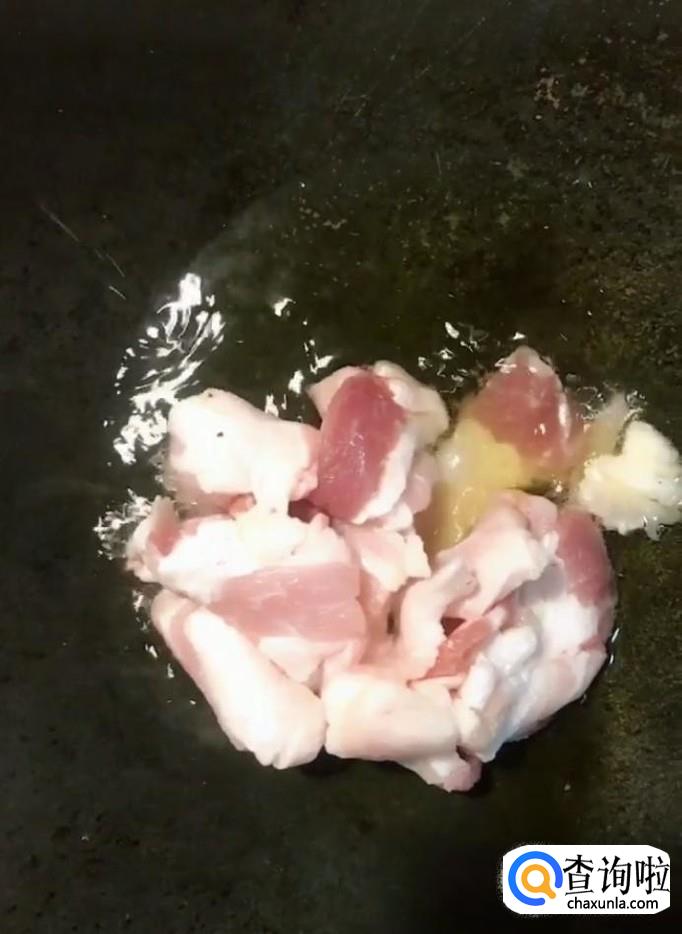 然后我们把五花肉切成片,接着在锅中放入少许油,油热放入切好的五花肉,炒一会再放入干辣椒,葱花,炒出香味
