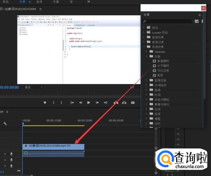 在打开的效果面板中,找到变换,鼠标左键选中水平变换,拖动到视频文件上