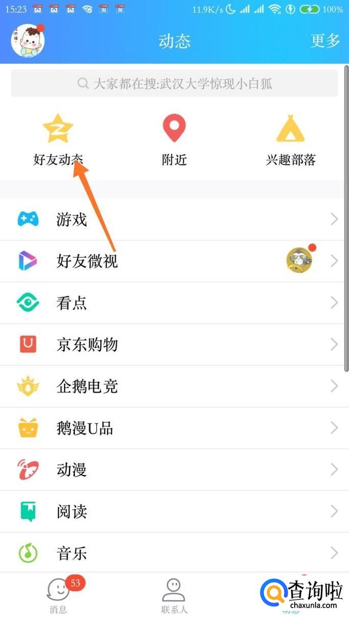 打开最新版的手机QQ,点击“动态”,然后点击“好友动态”。