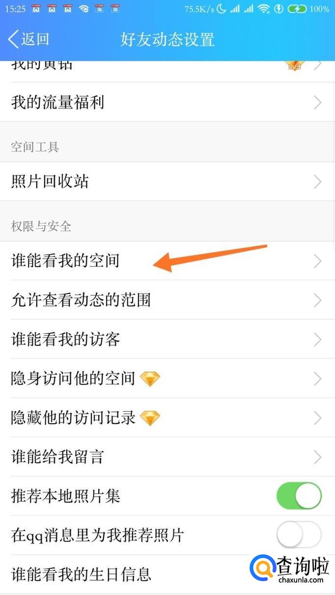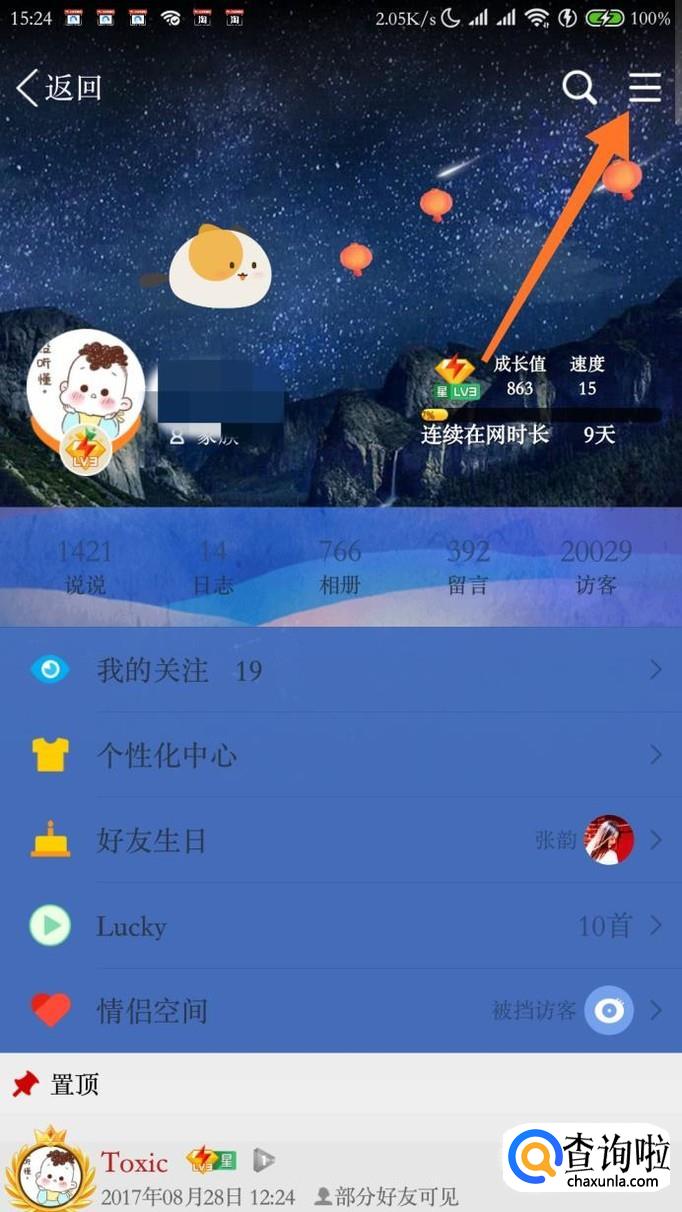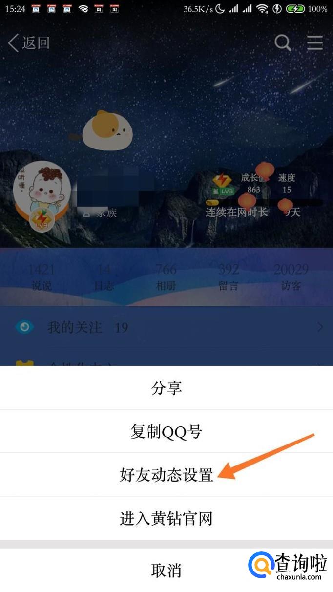 这里就是我们自己的空间了,点击右上角,弹窗点击“好友动态设置”。