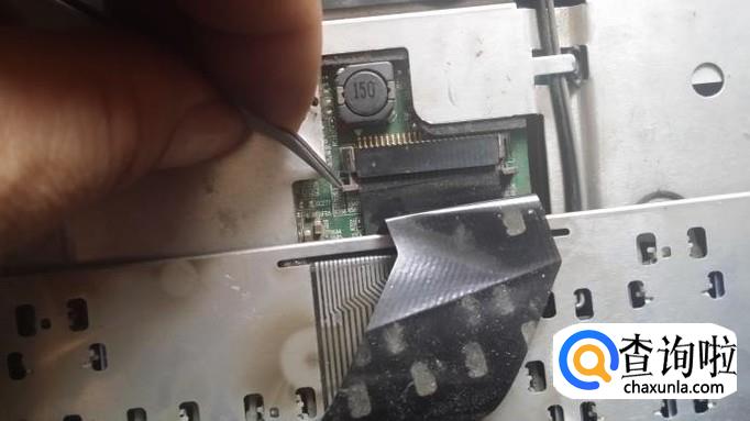 把排线插座两边的塑料卡扣推出,才能抽出排线,这样键盘就拆下来了。