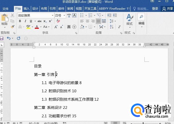 进入【引用】-【目录】-【手动目录】,这样就可以直接插入目录,修改目录上的内容即可。