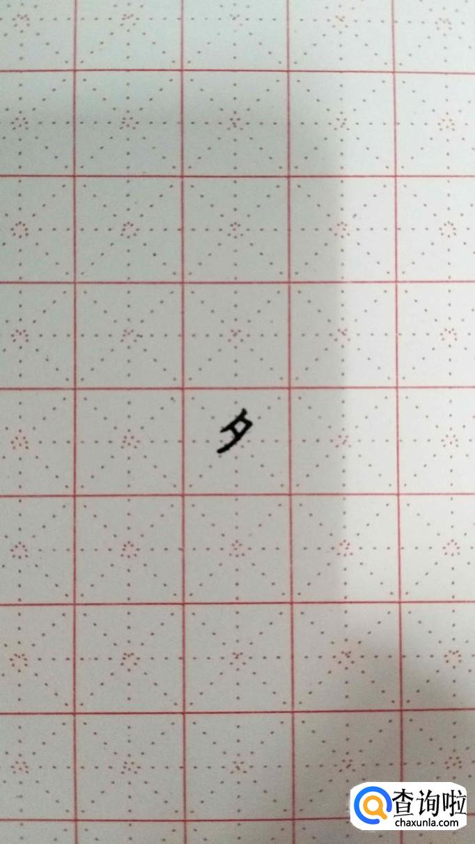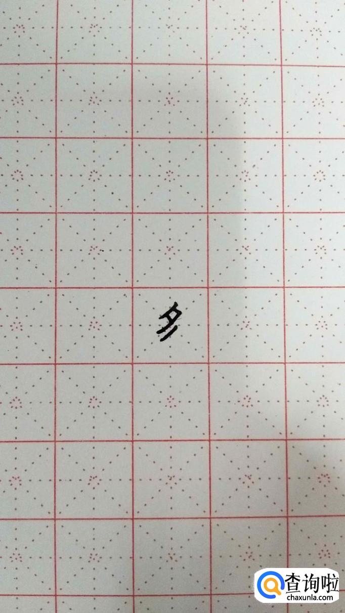 在一撇的上半部分1/3处开始写折撇,在第一撇下半部分的1/3处写下一中间的点。可以看到,在田字格上方有一个夕字。