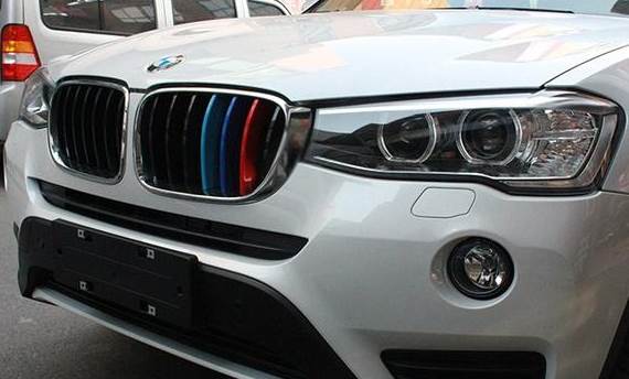 在宝马M系中的所有车型,如M3、M5、M6等等这些官方车型中,中网也都没有看到那种长长的三色彩条,而是在车尾部或者前中网上有一个M系特有的三色小铭牌。而跟M紧紧相关的这三色彩条,从小小的铭牌上演变成为了进气格栅上非常有标志性的三色进气格栅,远远看上去,也跟M也非常形似。所以,我们看到所有那种长长的三色彩条,都是宝马车主自己加装出来的。