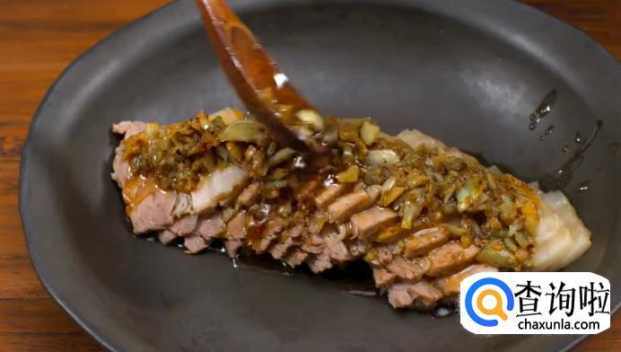 这时候肉已经吸饱了肉汤,取出来切片,注意肉不要切太薄。之后切好装盘淋上酱汁就可以了。