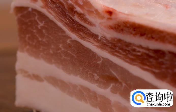 首先选一块宽约四指,厚约三指的土猪五花肉,肥瘦比例以3:7为宜,褪毛留皮洗净。