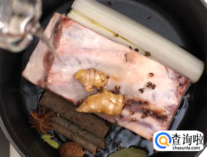 之后将肉放到汤锅里,加大葱一段,生姜、桂皮、八角、草果、茴香、花椒,再加少许料酒。注入清水,开火煮。