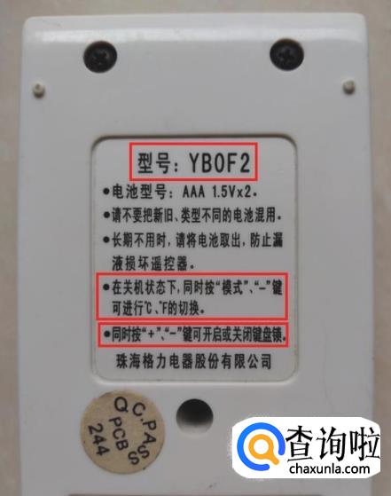 首先看一下遥控器背后的说明,型号为YBOF2,有两个组合键隐藏功能以及电池的使用注意事项。
