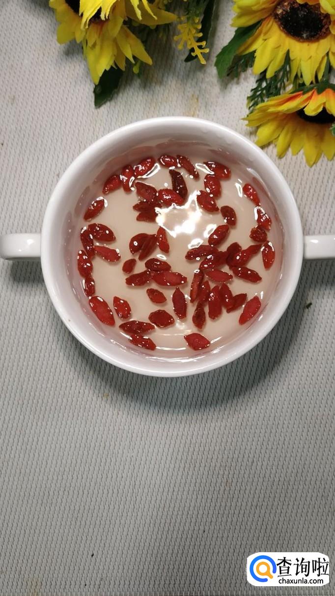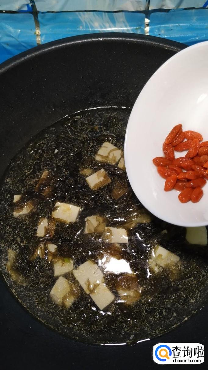 将泡好的紫菜和泡发的枸杞子倒入锅中,搅拌均匀。