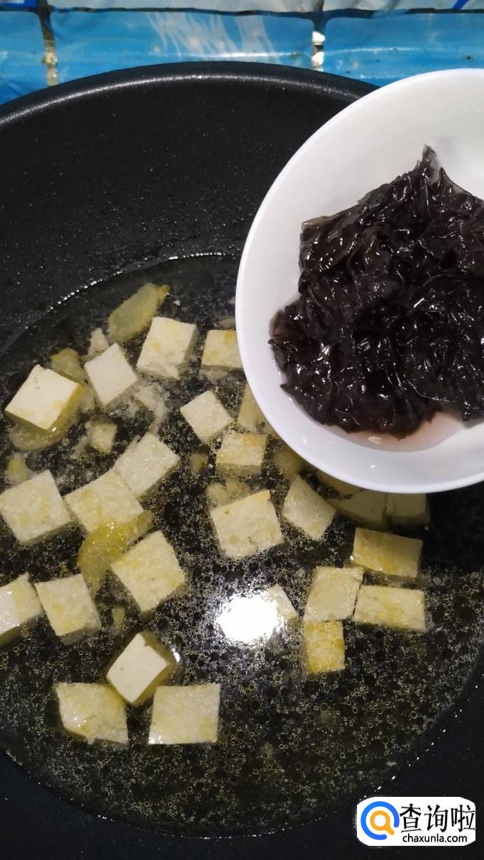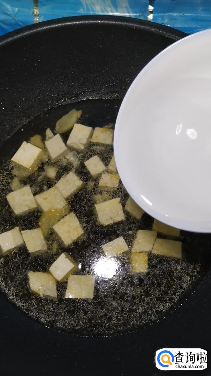 将切好的豆腐块放入锅中,翻炒均匀,可以小火煎一会儿,让豆腐微微上色。