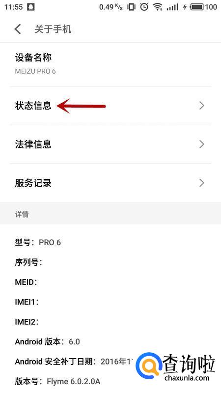 在手机设备信息中,选择“状态信息”。