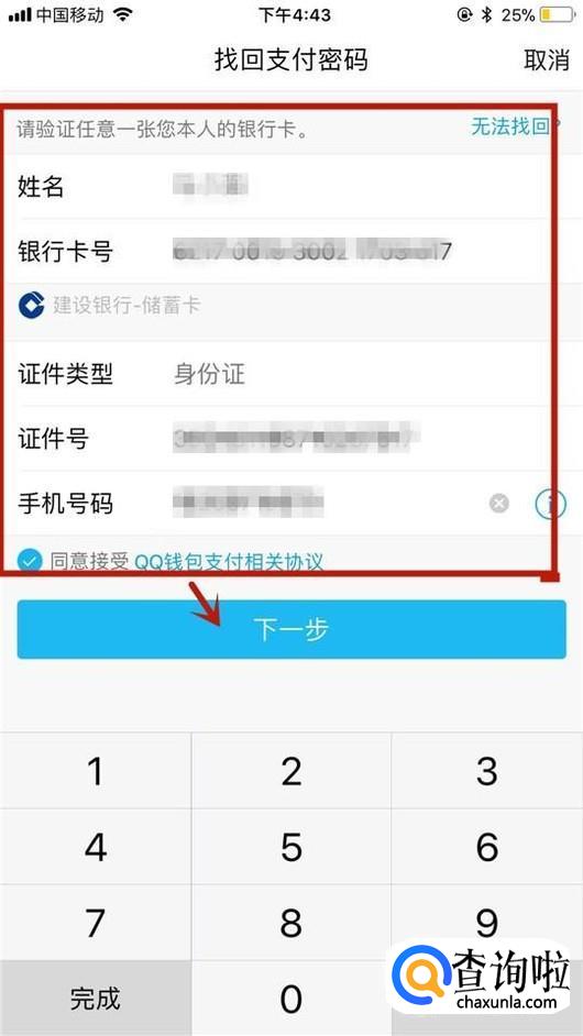 然后输入你的银行卡号并点击下一步,如下图所示。
