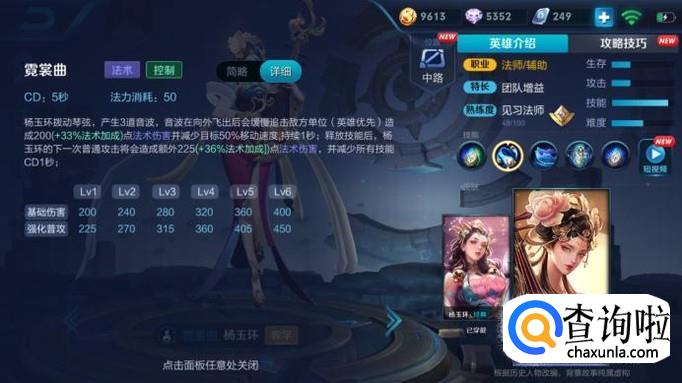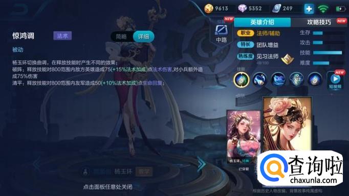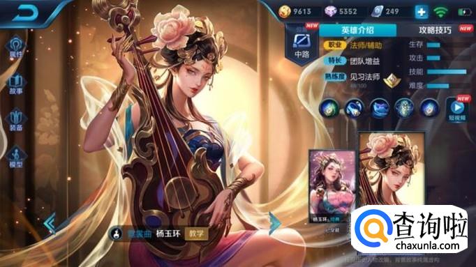 杨玉环是一个不太好操作的英雄,定位是辅助,并不是很高的输出全靠技能,有两套技能,一套可以打出伤害,另外一套主要用来奶队友,给队友不断加血,在下路配合ADC比较能打出这个英雄的水平,不推荐走中路。