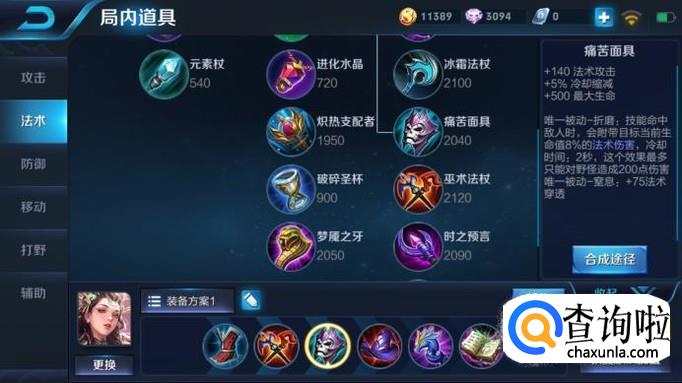 第三件装备出痛苦面具,这是件比较全能的法术装备,加法攻,加冷却缩减,加最大生命值,并且还有一个被动效果,可以弥补杨玉环伤害不够的缺陷。