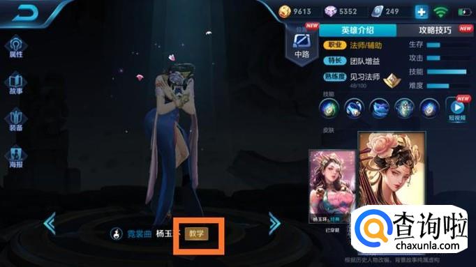 按例先来看英雄技能,这个英雄有两套技能,可能天美爸爸也觉得自己把这个英雄设计的让人暂时无法适应,官方良心的出了一套教学关卡,在英雄界面的名字下方,就是如图框起来的那里。两套技能释放效果是一样的,只是额外效果不一样,一套加血,处于该状态时杨玉环脚下的光环是绿色的,还有一套是攻击被动,该状态下杨玉环脚下的光环是蓝色的。